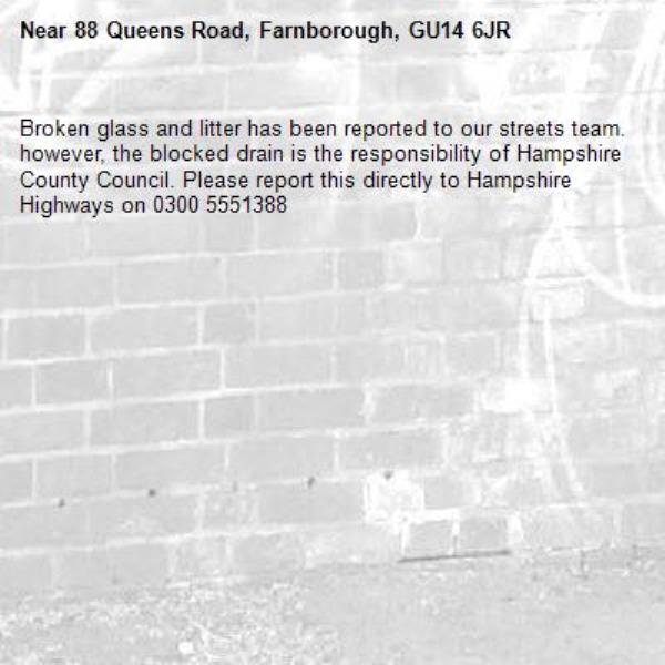 Broken glass and litter has been reported to our streets team. however, the blocked drain is the responsibility of Hampshire County Council. Please report this directly to Hampshire Highways on 0300 5551388