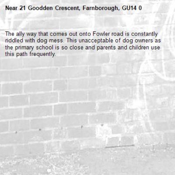 The ally way that comes out onto Fowler road is constantly riddled with dog mess. This unacceptable of dog owners as the primary school is so close and parents and children use this path frequently.