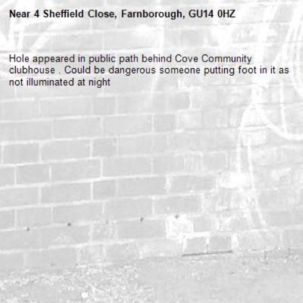 Hole appeared in public path behind Cove Community clubhouse . Could be dangerous someone putting foot in it as not illuminated at night