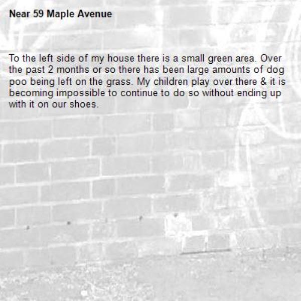 To the left side of my house there is a small green area. Over the past 2 months or so there has been large amounts of dog poo being left on the grass. My children play over there & it is becoming impossible to continue to do so without ending up with it on our shoes.