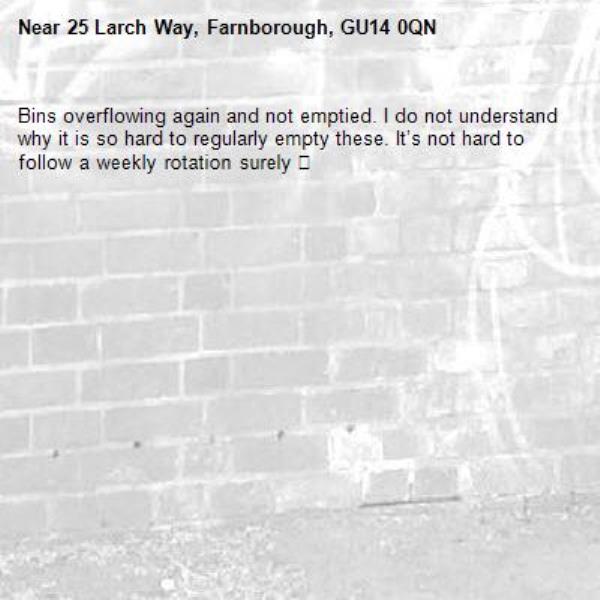Bins overflowing again and not emptied. I do not understand why it is so hard to regularly empty these. It’s not hard to follow a weekly rotation surely 😡