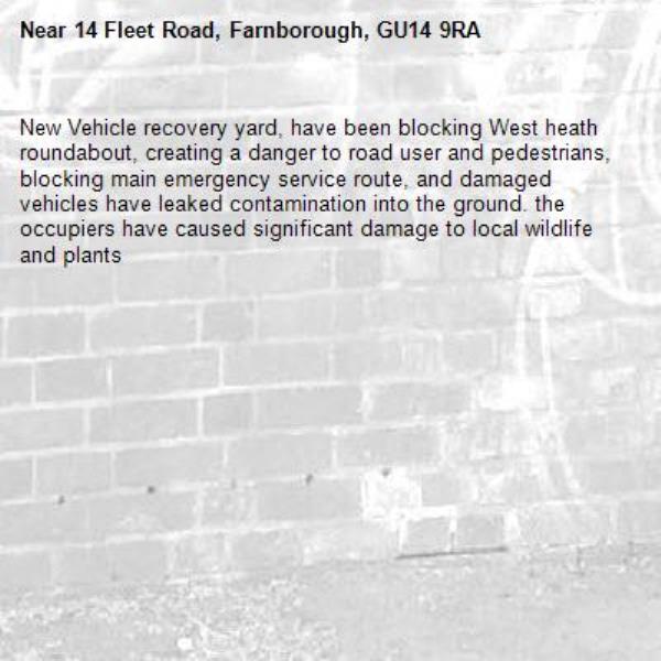 New Vehicle recovery yard, have been blocking West heath roundabout, creating a danger to road user and pedestrians, blocking main emergency service route, and damaged vehicles have leaked contamination into the ground. the occupiers have caused significant damage to local wildlife and plants