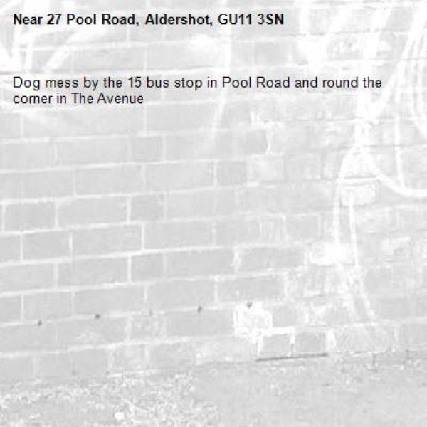 Dog mess by the 15 bus stop in Pool Road and round the corner in The Avenue