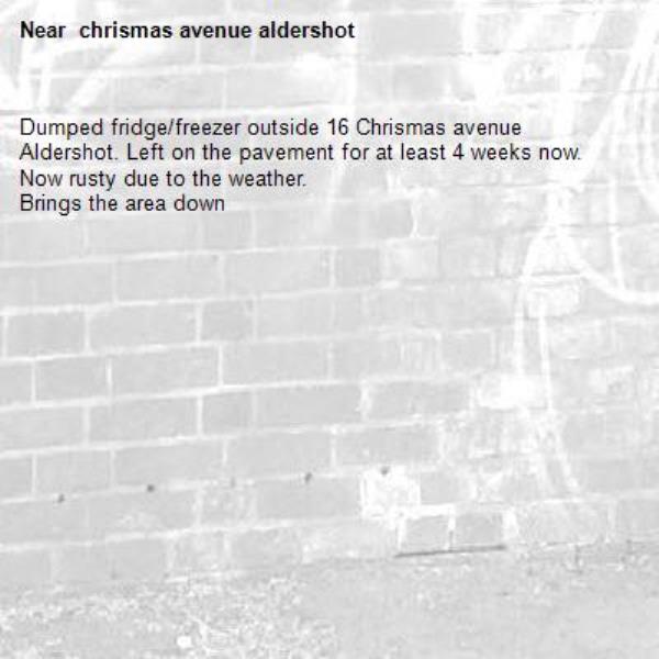 Dumped fridge/freezer outside 16 Chrismas avenue Aldershot. Left on the pavement for at least 4 weeks now. Now rusty due to the weather.<br/>Brings the area down