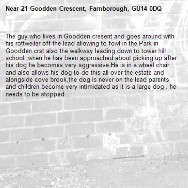 The guy who lives in Goodden cresent and goes around with his rottweiler off the lead allowing to fowl in the Park in Goodden crst also the walkway leading down to tower hill school ,when he has been approached about picking up after his dog he becomes very aggressive.He is in a wheel chair and also allows his dog to do this all over the estate and alongside cove brook,the dog is never on the lead parents and children become very intimidated as it is a large dog . he needs to be stopped