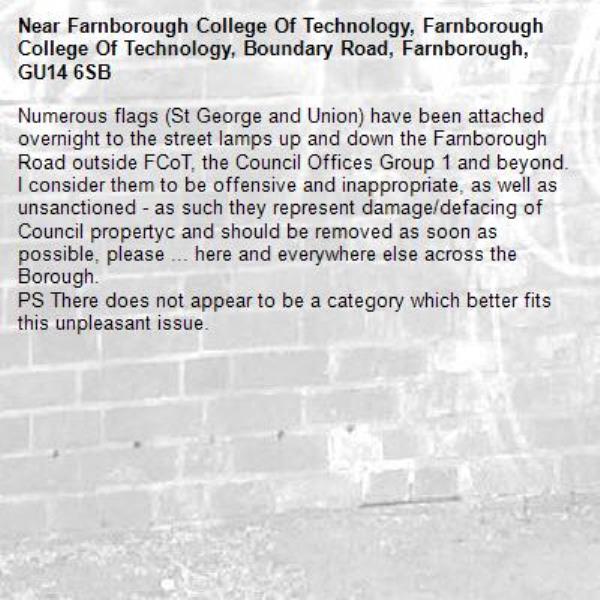 Numerous flags (St George and Union) have been attached overnight to the street lamps up and down the Farnborough Road outside FCoT, the Council Offices Group 1 and beyond.<br/>I consider them to be offensive and inappropriate, as well as unsanctioned - as such they represent damage/defacing of Council propertyc and should be removed as soon as possible, please ... here and everywhere else across the Borough.<br/>PS There does not appear to be a category which better fits this unpleasant issue.