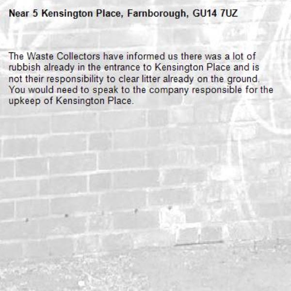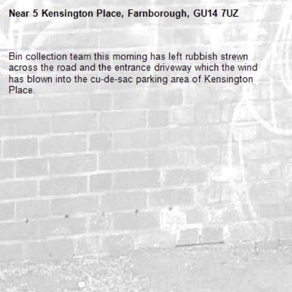 Bin collection team this morning has left rubbish strewn across the road and the entrance driveway which the wind has blown into the cu-de-sac parking area of Kensington Place.