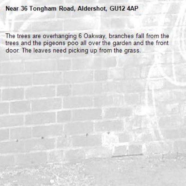 The trees are overhanging 6 Oakway, branches fall from the trees and the pigeons poo all over the garden and the front door. The leaves need picking up from the grass.